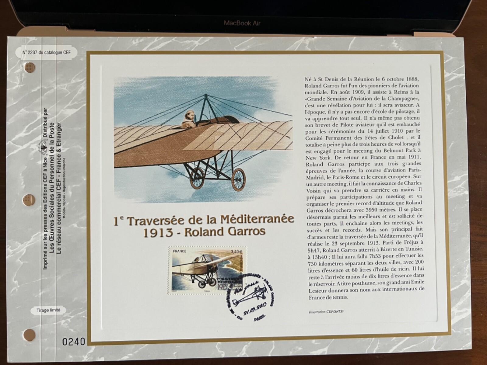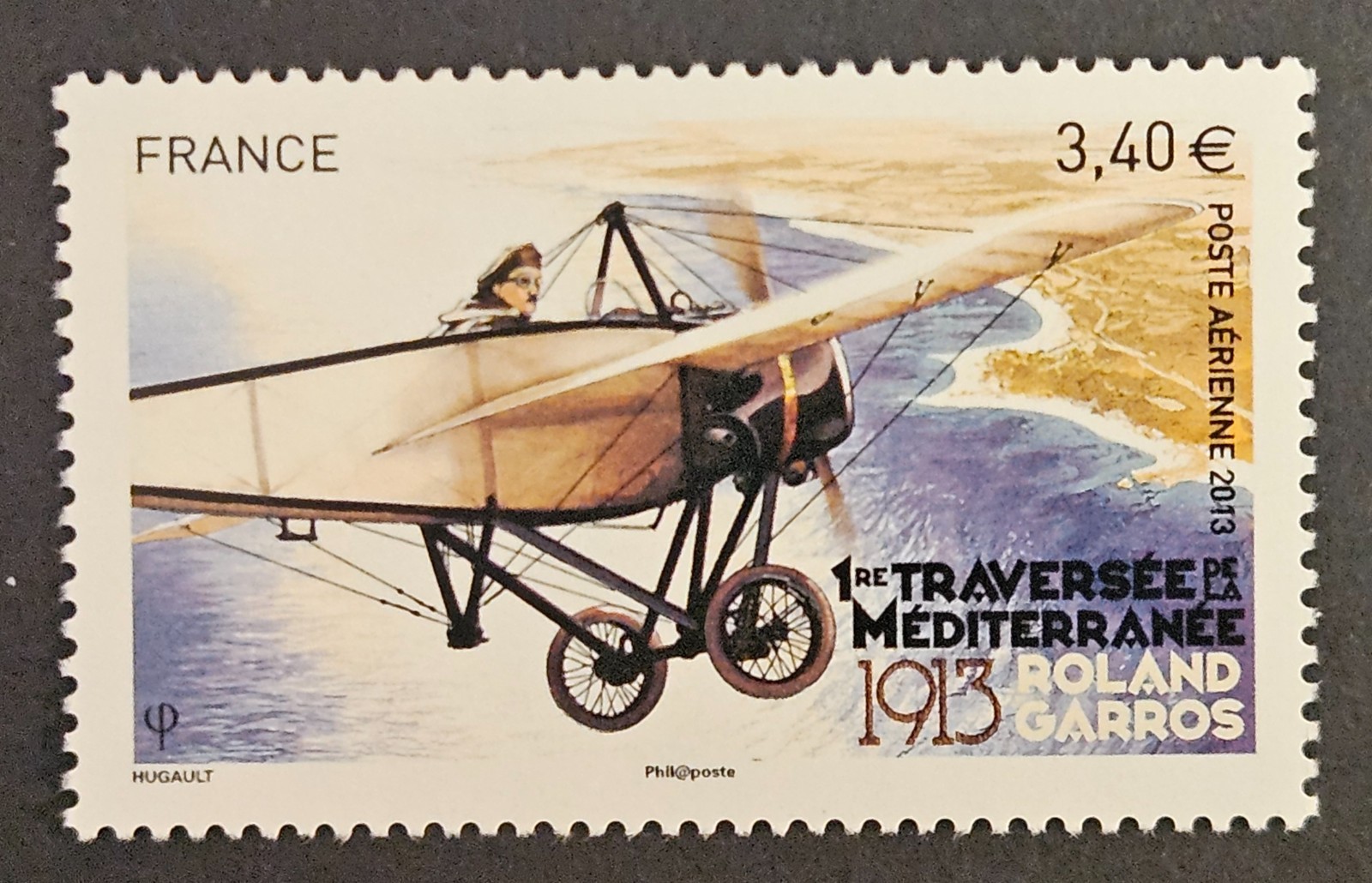 Description du Timbre : Première traversée de la Méditerranée - 1913 - Roland Garros, aviateur français, né à Saint-Denis de La Réunion