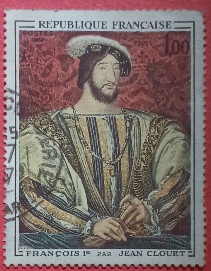 Description du Timbre : Portrait de François Ier (1494-1547), né à Cognac, par Jean Clouet. Tableau exposé au musée du Louvre.