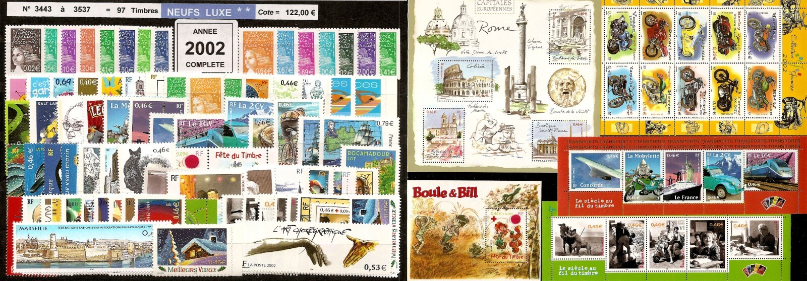 FRANCE- ANNEE 2002 Complète 97 Timbres NEUFS** du N° 3443 au 3537 LU