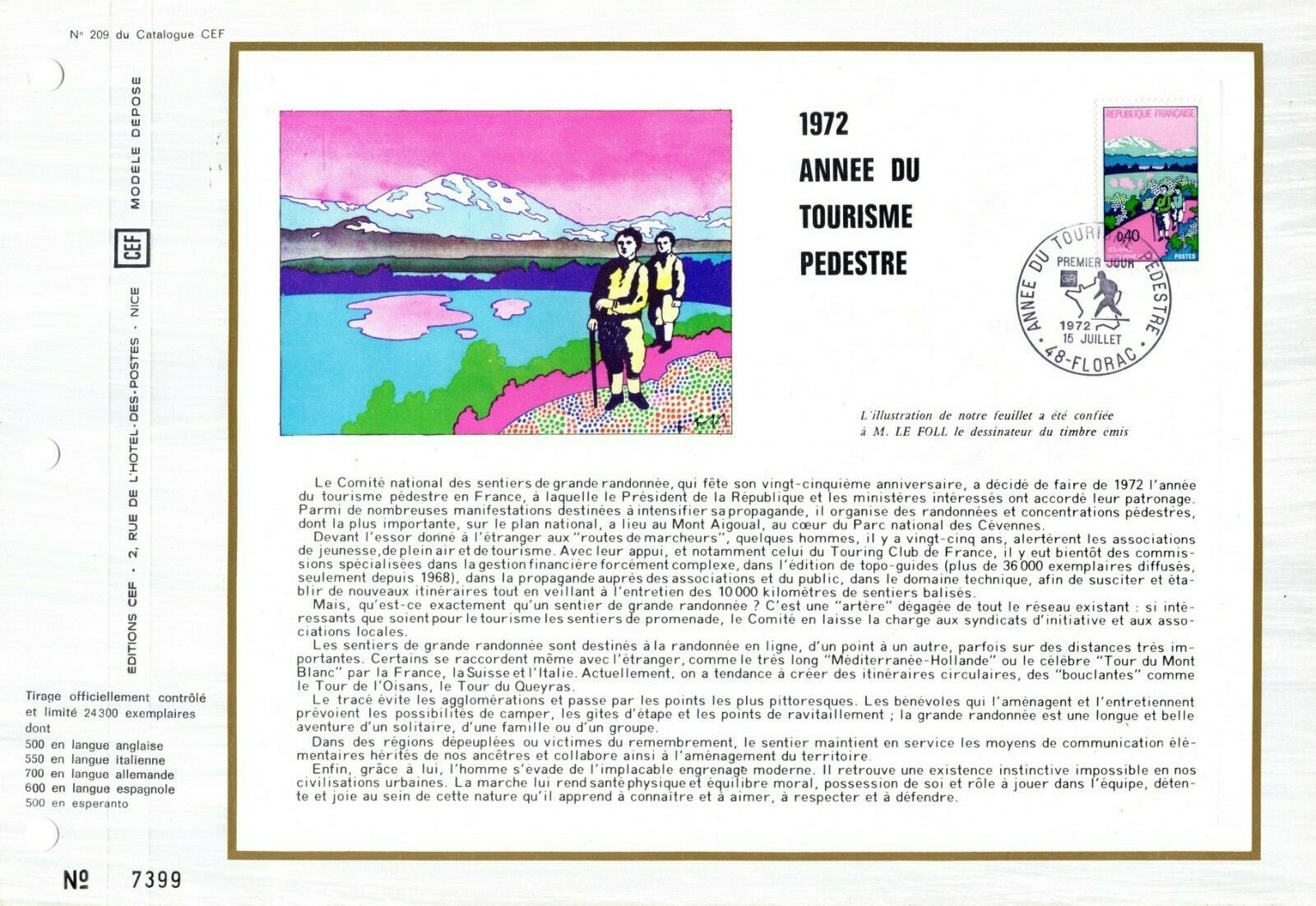 1723++FEUILLET CEF 1er JOUR 1972 ANNEE DU TOURISME PEDESTRE