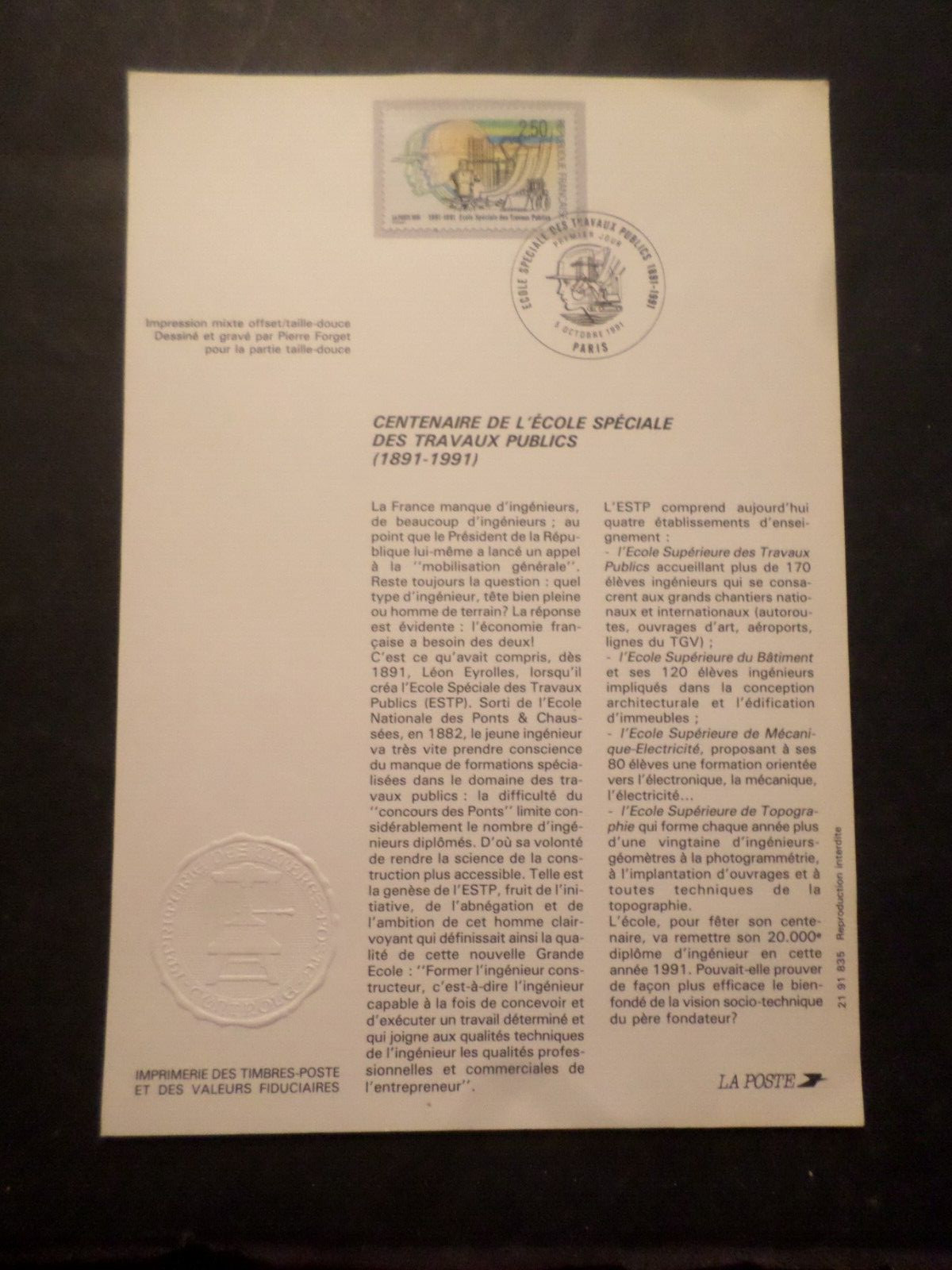FRANCE 1991 NOTICE DOCUMENT FDC timbre 2726 ECOLE TRAVAUX PUBLICS 1°