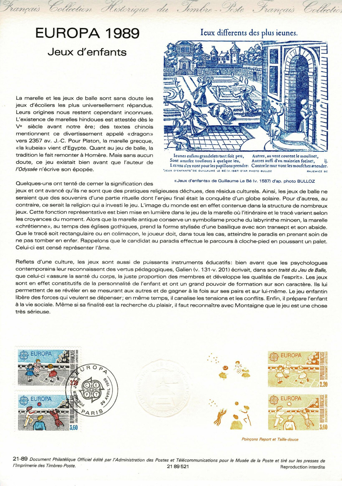 FRANCE DOCUMENT ARTISTIQUE YVERT 2585 JEUX D'ENFANT EUROPA PARIS 1989